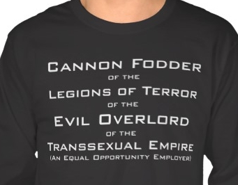 So I unilaterally declared myself Evil Overlord of the Transsexual Empire, and began to fill the ranks of my Legions of Terror. And it's easy to join my Legions of Terror! We are an Equal Opportunity Employer, so you don't have to be transsexual or transgendered to join -- you just have to be terrifying to the ordinary mundane status quo.